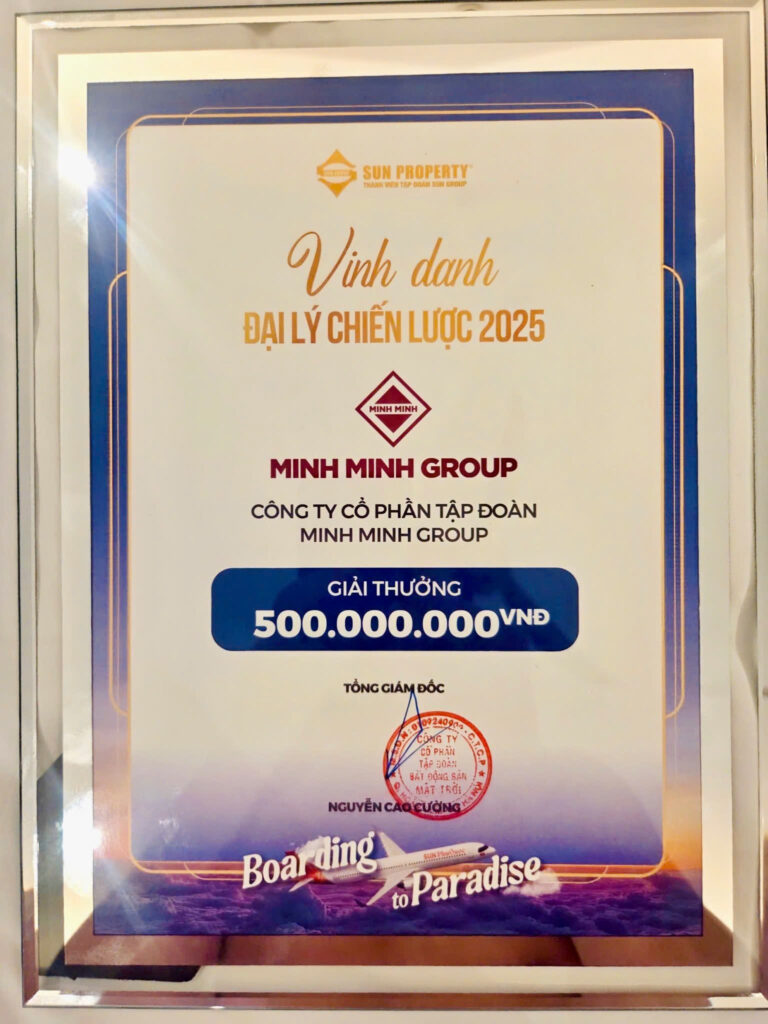 Ngày 12/01, tại chương trình gặp mặt Đại lý phân phối Sun Property, MINH MINH GROUP được vinh danh là Top 2 Đại lý chiến lược 2025 Toàn quốc và Top 1 Đại lý chiến lược Miền Trung với phần thưởng 500 triệu đồng. Đây là thành quả rất đáng tự hào và là minh chứng cho những nỗ lực của tập thể Minh Minh Group.